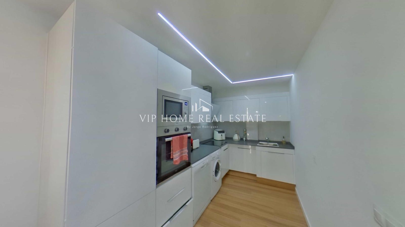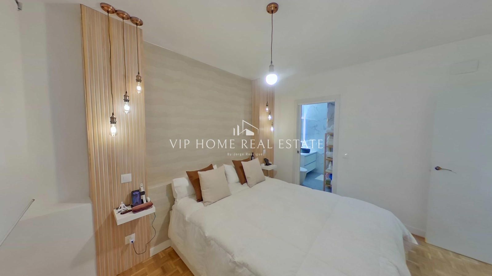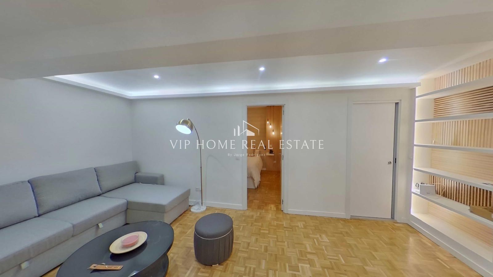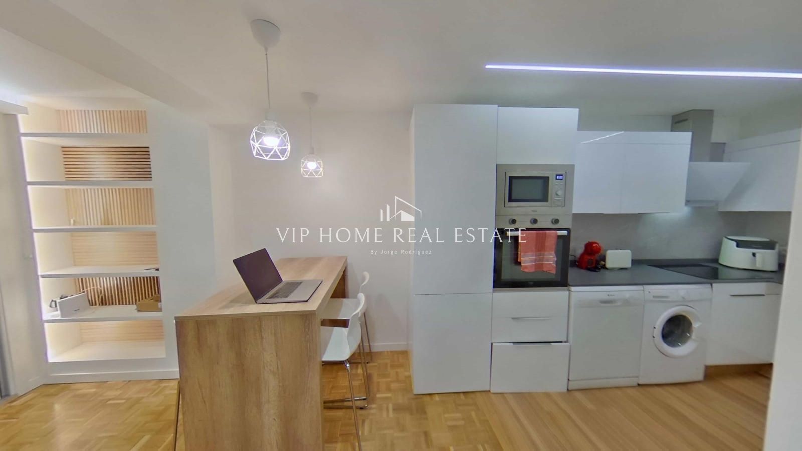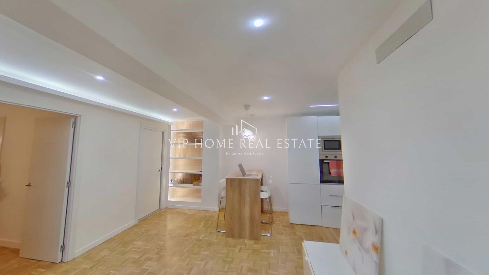 Al entrar, nos recibe un espacio de concepto abierto donde el salón y el comedor convergen de forma armoniosa. Los suelos de parqué en tonos naturales y la iluminación indirecta mediante foseados LED en el techo crean una atmósfera cálida y sofisticada. La cocina, minimalista y funcional, está equipada con electrodomésticos integrados y una práctica barra de madera, ideal para desayunos o cenas informales.
