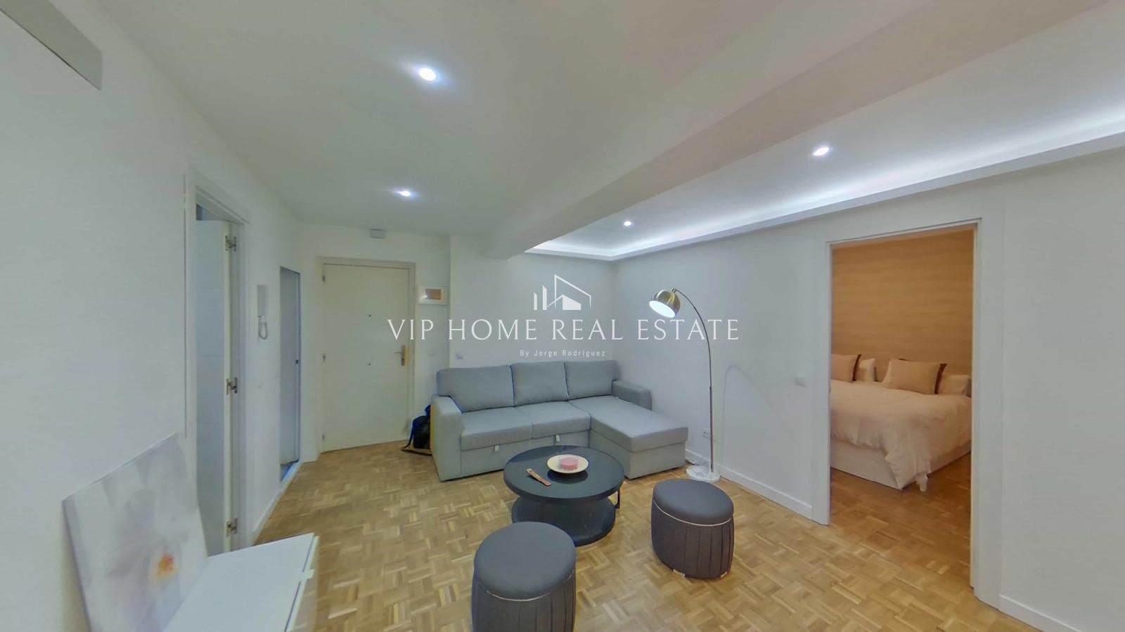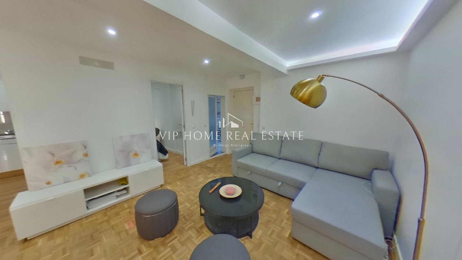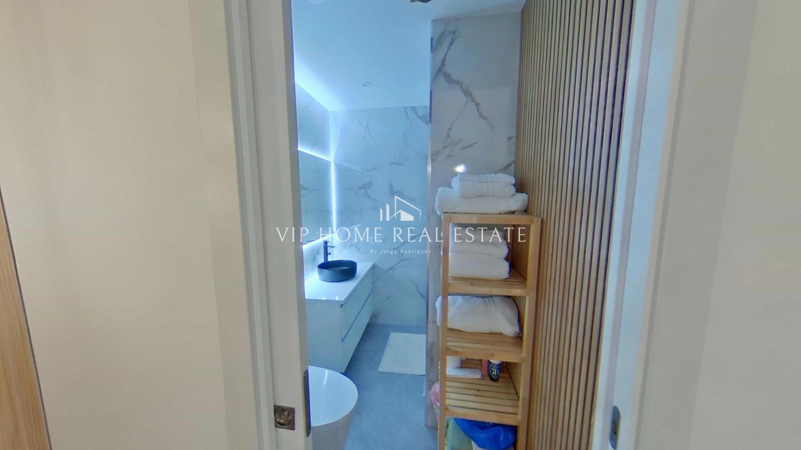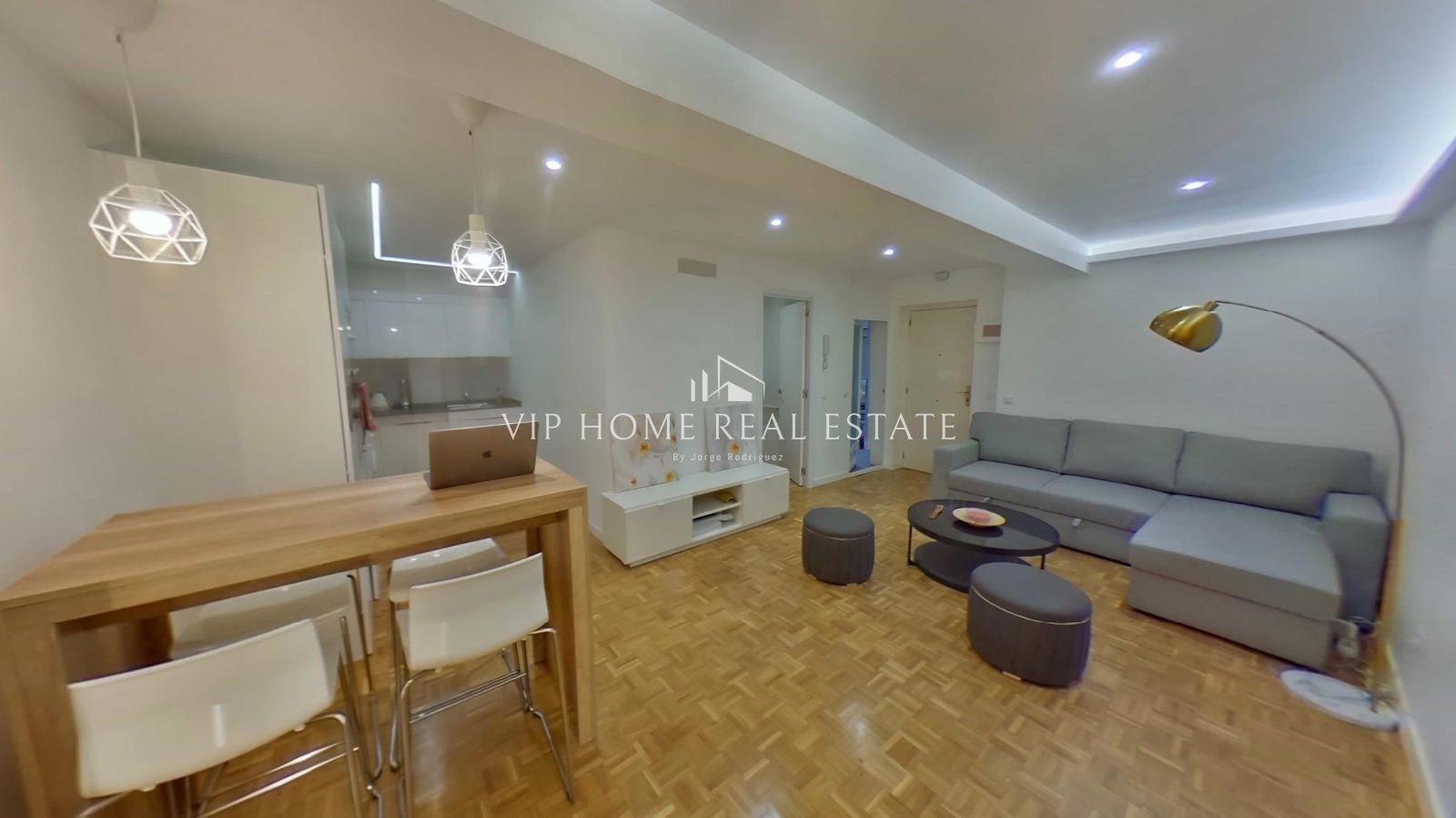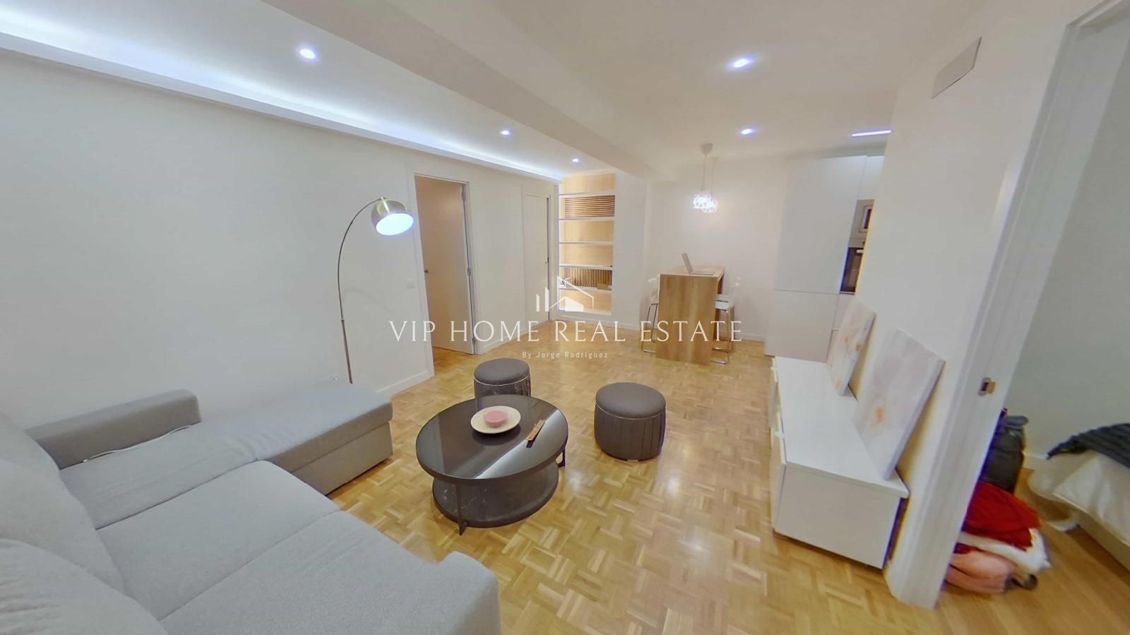 Al entrar, nos recibe un espacio de concepto abierto donde el salón y el comedor convergen de forma armoniosa. Los suelos de parqué en tonos naturales y la iluminación indirecta mediante foseados LED en el techo crean una atmósfera cálida y sofisticada. La cocina, minimalista y funcional, está equipada con electrodomésticos integrados y una práctica barra de madera, ideal para desayunos o cenas informales.