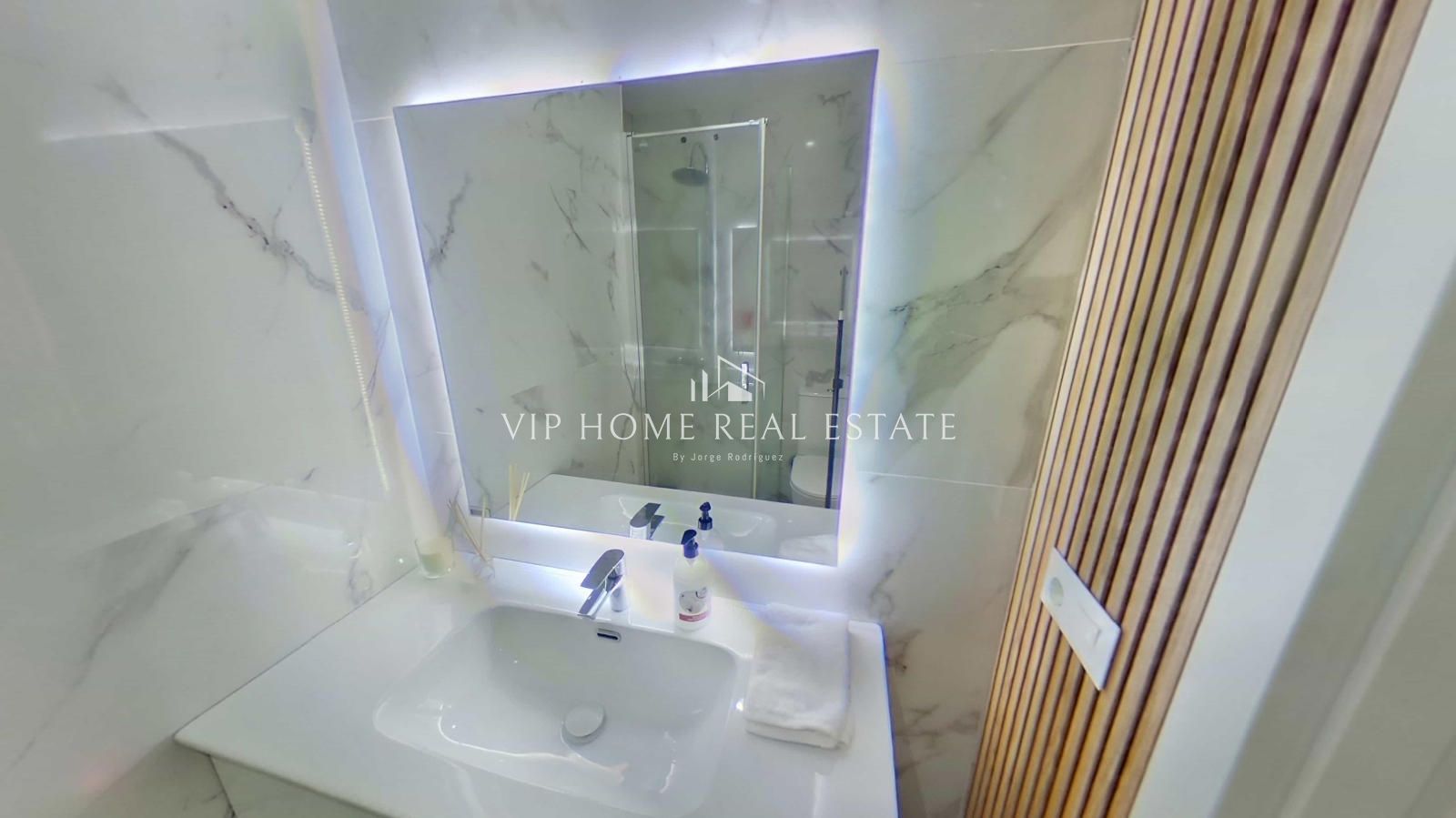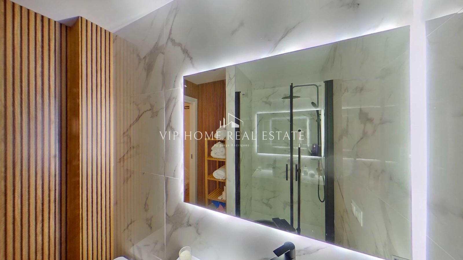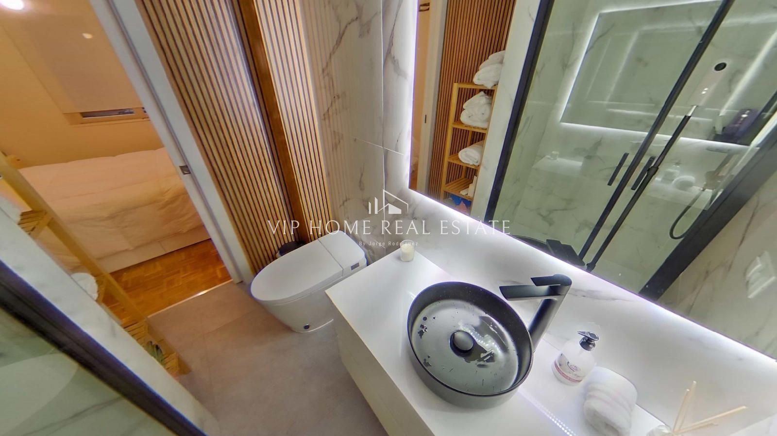 El dormitorio principal destaca por su tranquilidad y aprovechamiento del espacio, manteniendo la estética de líneas limpias del resto de la vivienda. Sin embargo, es el cuarto de baño el que aporta el toque definitivo de distinción: revestimientos cerámicos de gran formato con efecto mármol, un lavabo sobre encimera de diseño negro mate y un espejo retroiluminado que evoca el lujo de un hotel boutique.