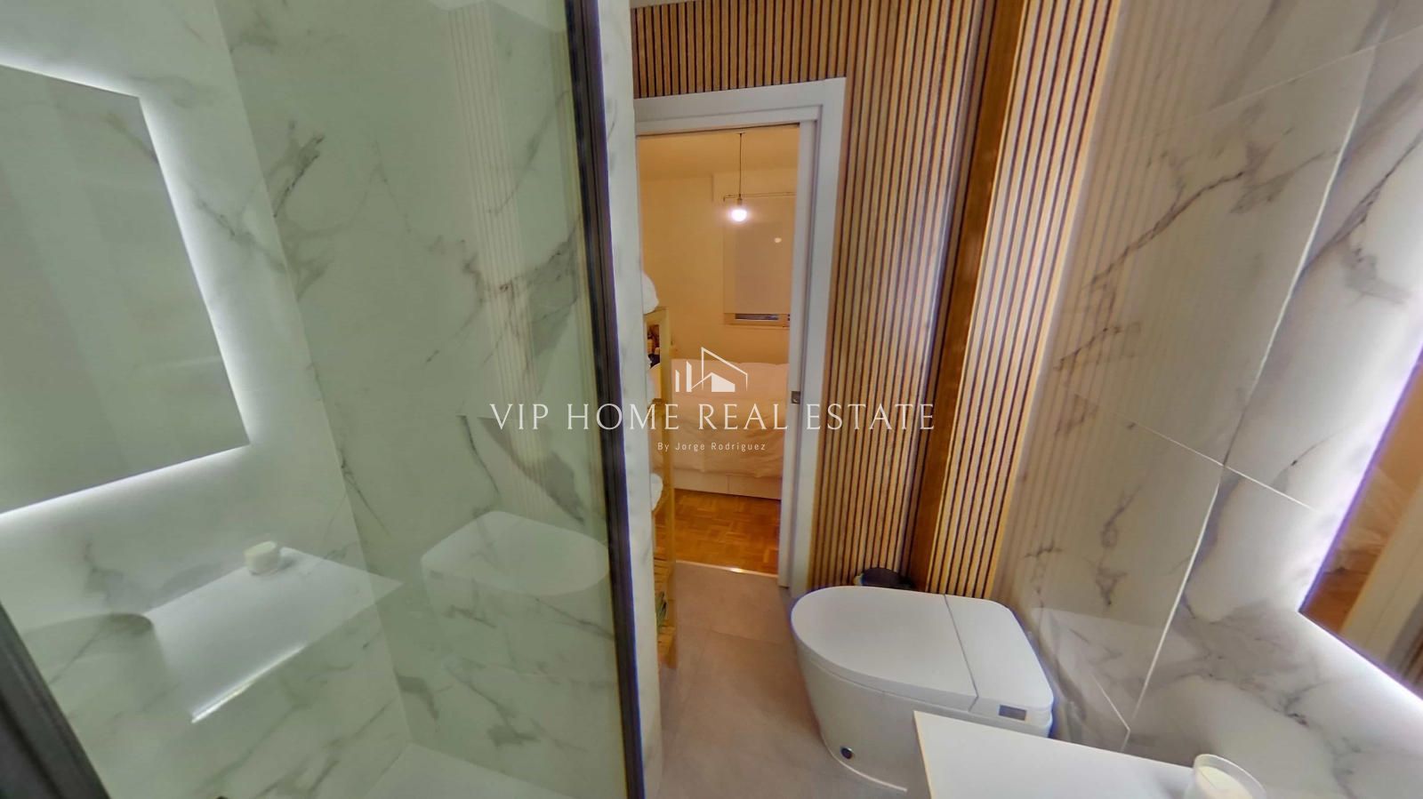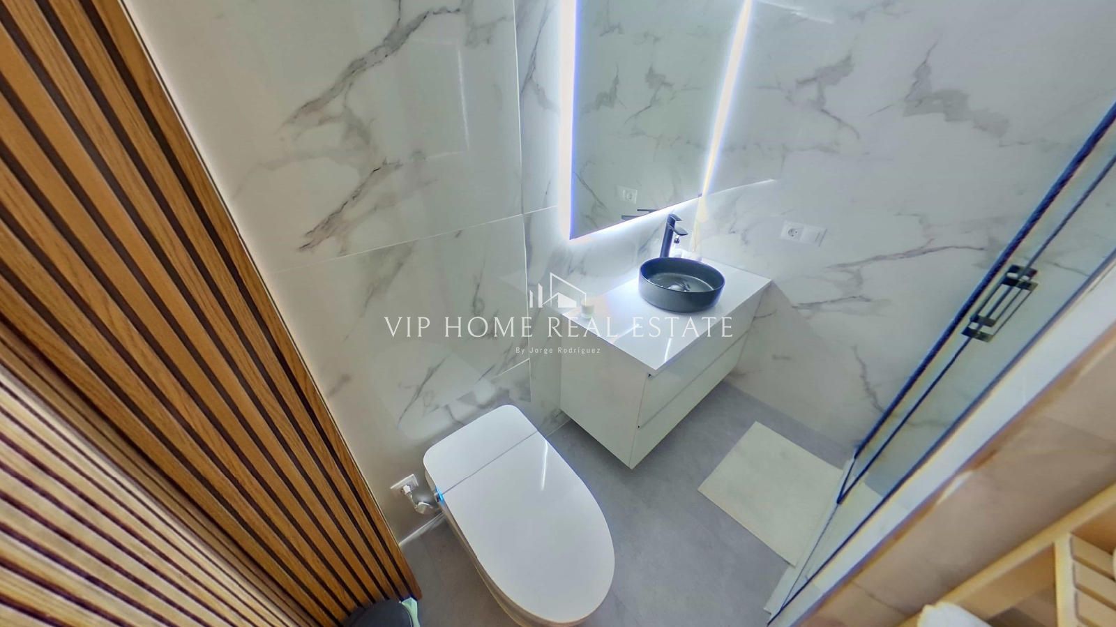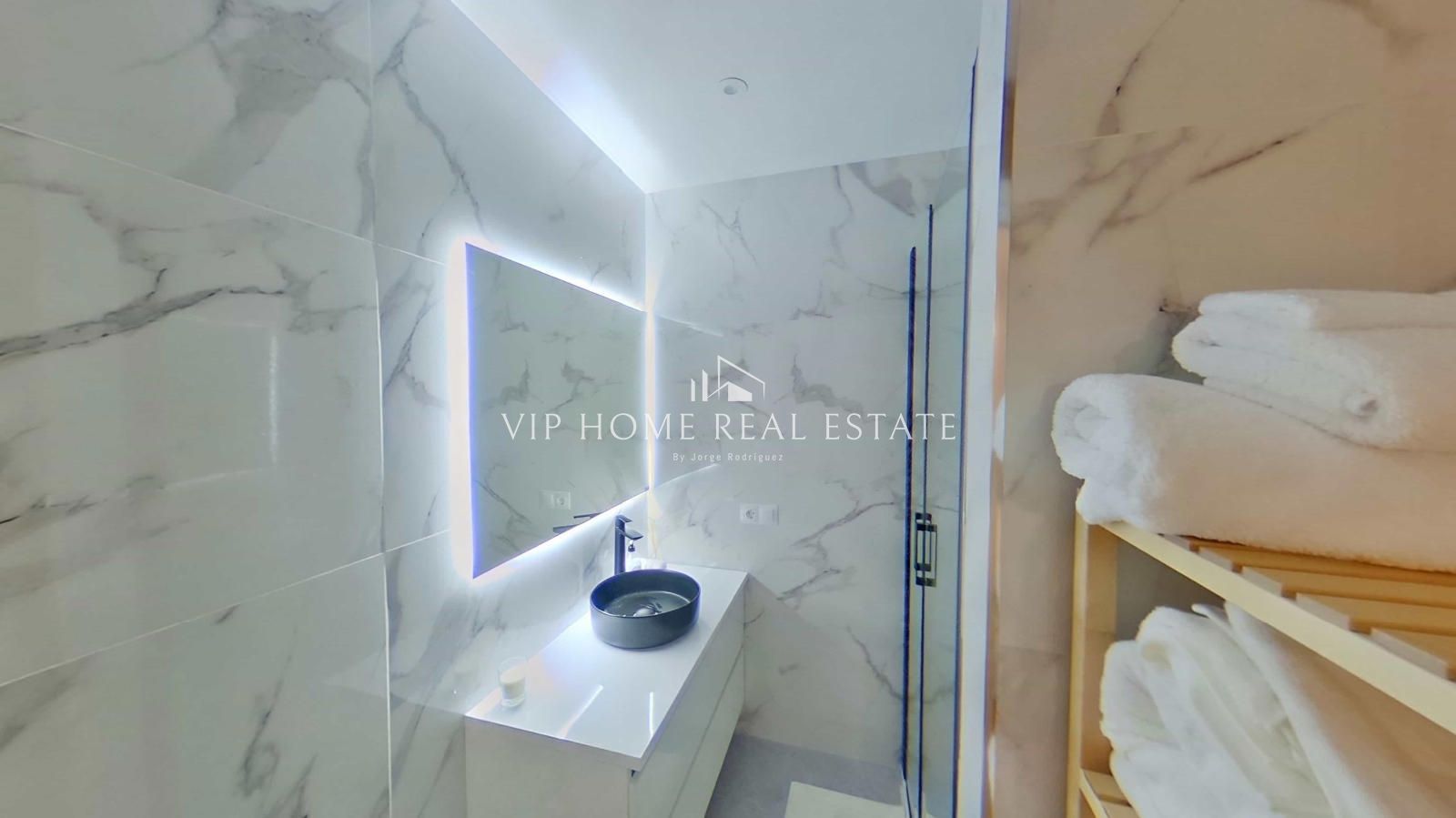 El dormitorio principal destaca por su tranquilidad y aprovechamiento del espacio, manteniendo la estética de líneas limpias del resto de la vivienda. Sin embargo, es el cuarto de baño el que aporta el toque definitivo de distinción: revestimientos cerámicos de gran formato con efecto mármol, un lavabo sobre encimera de diseño negro mate y un espejo retroiluminado que evoca el lujo de un hotel boutique.